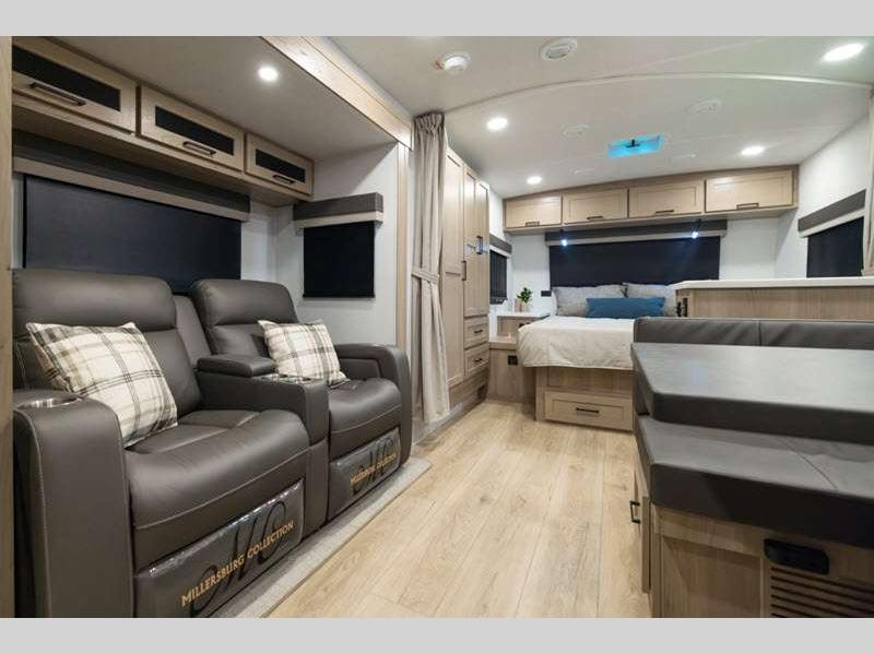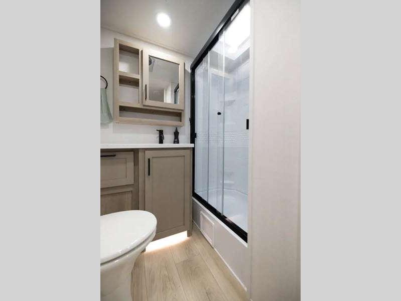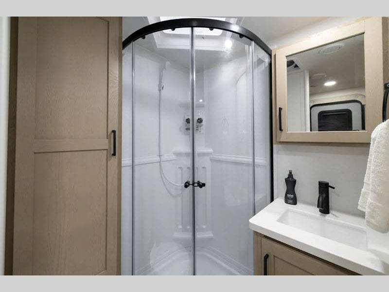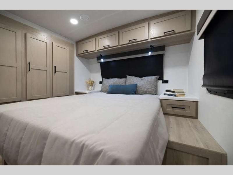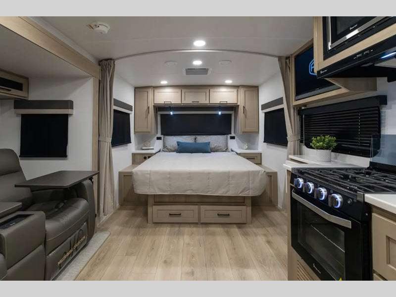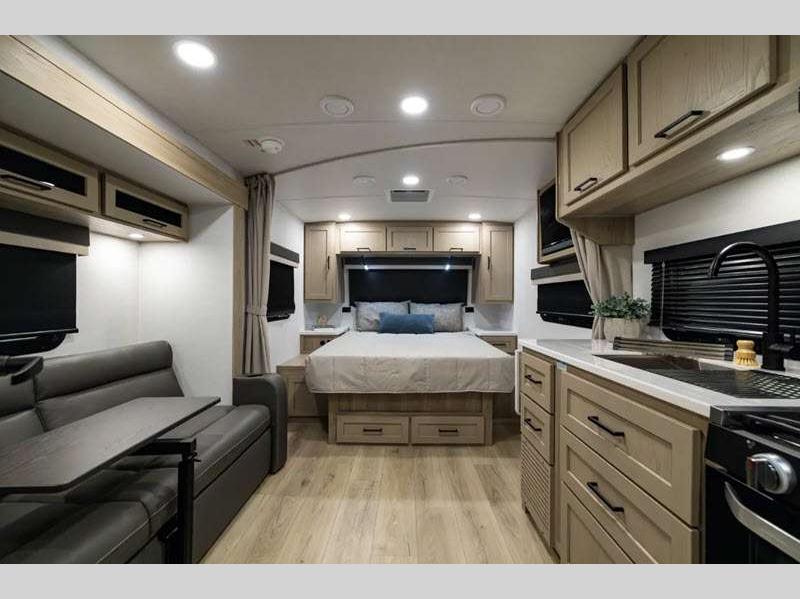 Each model is constructed with a fully laminated walkable roof, 6-sided full-aluminum frame, and a fiberglass front cap with Clear Coat for added protection. You will appreciate the slam baggage doors and 200W solar panel outside, plus there is a Climate Protection Package for better insulation. Inside, you'll love the solid surface countertops, roller shades, and soft close roller bearing drawers.