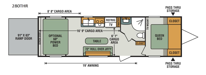 Step inside to comfort and fun when you enter this Sportster 100 model 280THR toy hauler travel trailer. This model features sleeping space for six people, and enough cargo space to load up your toys including a 91" x 83" cargo ramp with screen door!